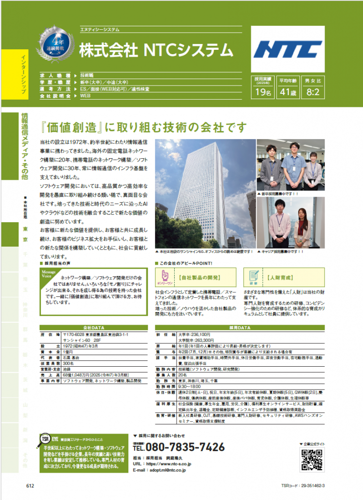 | 休日、休暇 | 週休2日制(土・日)、祝日、年末年始(5日) 年次有給休暇、夏期休暇(5日)、GW休暇(2日) 慶弔休暇、傷病休暇、産前産後休暇、産後パパ休暇 育児休暇、介護休暇、生理休暇等 |